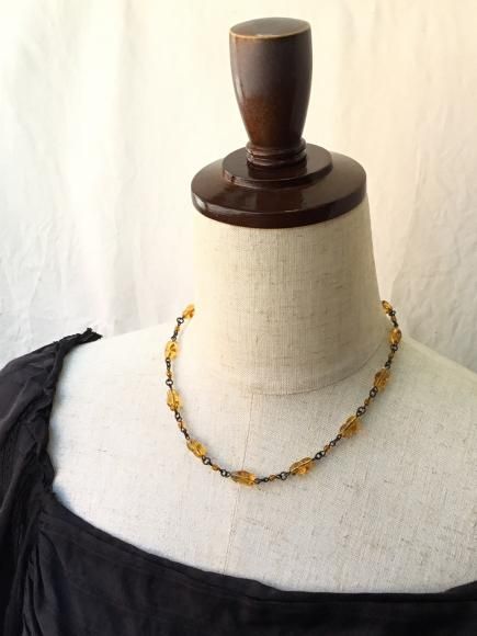 琥珀のような色合いで、光が当たると透明感が綺麗でシックな大人っぽいネックレスです。