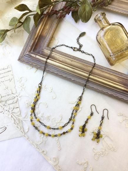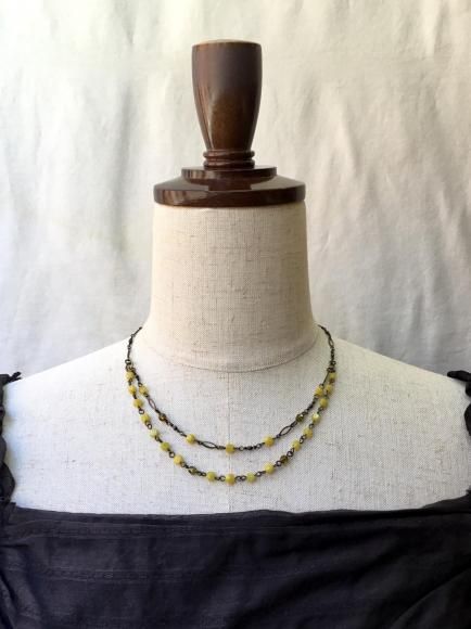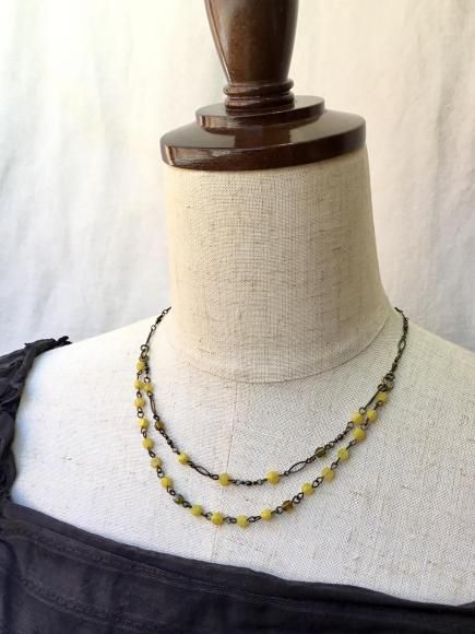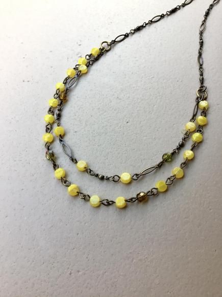 所々に約4mmのカーキ色とオリーブ色のファセットビーズを入れ、リズム感のあるデザインにしました。落ち着いた深い色のイエローなので、季節を問わずに着けていただけます。