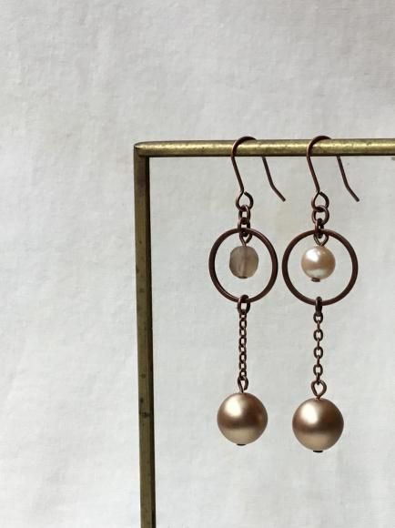 片方ずつリングパーツの中のビーズを変えてアシンメトリーのデザインにしています。右側のリングパーツに入れてるアイボリー色のパールビーズは、1950年代のスペイン製のヴィンテージビーズ。サイズは約6mm。