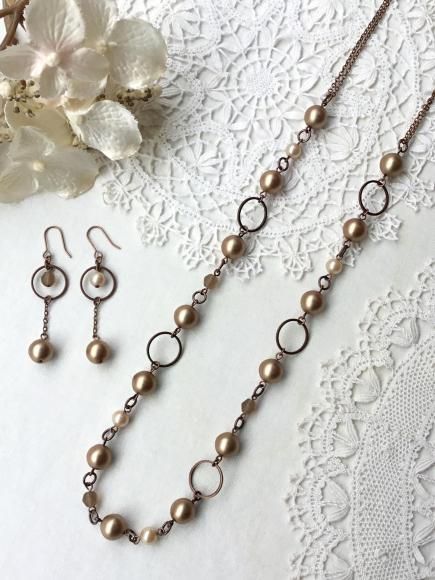 ブラウン系のシックな色合いですが、パールビーズを使用しているので、華やかさもあり、フォーマルな装いにも着けていただけます。